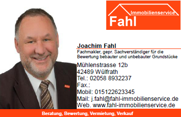 Wir bieten im Internet und in anderen Medien Immobilien zum Kauf oder zur Anmietung an. Indem Sie an einem der von uns angebotenen Kauf- oder Mietobjekte durch Kontaktaufnahme z. B. per Email, Telefon Interesse bekunden, kommt ein Maklervertrag zustande, dessen Inhalt unter Anderem die Vergütungsvereinbarung ist. Die Vergütung (Maklerprovision) ist nur im Erfolgsfall zu zahlen, nämlich dann, wenn der Kauf- oder Mietvertrag für das Objekt, das Sie interessiert, am Ende tatsächlich zustande kommt und im Exposè ein Vergütungshinweis aufgeführt ist. Wir sind verpflichtet, Sie auf Ihr Widerrufsrecht hinzuweisen. Hierzu dient die folgende Widerrufsbelehrung. Sie können Ihre Vertragserklärung innerhalb von 14 Tagen ohne Angabe von Gründen in Textform (z. B. Brief, Fax, E-Mail) widerrufen. Die Frist beginnt nach Erhalt dieser Belehrung in Textform bzw. mit der Nutzung de Kontaktformulars. Zur Wahrung der Widerrufsfrist genügt die rechtzeitige Absendung des Widerrufs. Der Widerruf ist zu richten an: Fahl Immobilienservice, Mühlenstr 12b, 42489Wülfrath Email: j.fah@fahl-immobilienservice.de . Folgen des Widerrufs Widerruft der Verbraucher den Maklervertrag, so sind die empfangenen Leistungen und die Herausgabe gezogener Nutzungen zurückzugewähren. Bei einer Maklerleistung, die vom Verbraucher ihrer Natur nach nicht zurückgewährt werden kann, hat der Verbraucher als Rückgewährschuldner Wertersatz nach § 346 Abs. 2 Nr.1 BGB zu leisten.