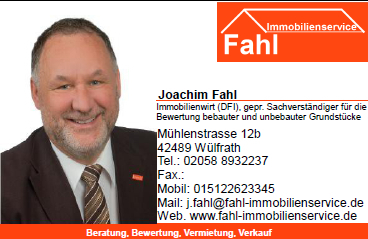 Sonstige Angaben:Widerrufsbelehrung: Wir bieten im Internet und in anderen Medien Immobilien zum Kauf oder zur Anmietung an. Indem Sie an einem der von uns angebotenen Kauf- oder Mietobjekte durch Kontaktaufnahme z. B. per Email, Telefon Interesse bekunden, kommt ein Maklervertrag zustande, dessen Inhalt unter Anderem die Vergütungsvereinbarung ist. Die Vergütung (Maklerprovision) ist nur im Erfolgsfall zu zahlen, nämlich dann, wenn der Kauf- oder Mietvertrag für das Objekt, das Sie interessiert, am Ende tatsächlich zustande kommt und im Exposè ein Vergütungshinweis aufgeführt ist. Da Ihnen, auf den Abschluss des Maklervertrages bezogen, ein Widerrufsrecht zusteht, sind wir verpflichtet, Sie auf Ihr Widerrufsrecht hinzuweisen. Hierzu dient die folgende Widerrufsbelehrung. Widerrufsbelehrung: Sie können Ihre Vertragserklärung innerhalb von 14 Tagen ohne Angabe von Gründen in Textform (z. B. Brief, Fax, E-Mail) widerrufen. Die Frist beginnt nach Erhalt dieser Belehrung in Textform bzw. mit der Nutzung de Kontaktformulars. Zur Wahrung der Widerrufsfrist genügt die rechtzeitige Absendung des Widerrufs. Der Widerruf ist zu richten an: Fahl Immobilienservice, Wilhelmstraße 177, 42489Wülfrath Email: j.fahl@fahl-immobilienservice.de, Fax: 02058 894155 Folgen des Widerrufs Widerruft der Verbraucher den Maklervertrag, so sind die empfangenen Leistungen und die Herausgabe gezogener Nutzungen zurückzugewähren. Bei einer Maklerleistung, die vom Verbraucher ihrer Natur nach nicht zurückgewährt werden kann, hat der Verbraucher als Rückgewährschuldner Wertersatz nach § 346 Abs. 2 Nr.1 BGB zu leisten.